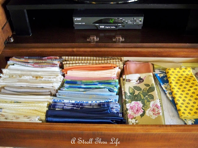 Napkins are another item that is hard to store. I use to have them in a drawer in the entertainment center since it was next to the kitchen. That worked great. You can see all the colors and choose what you want.