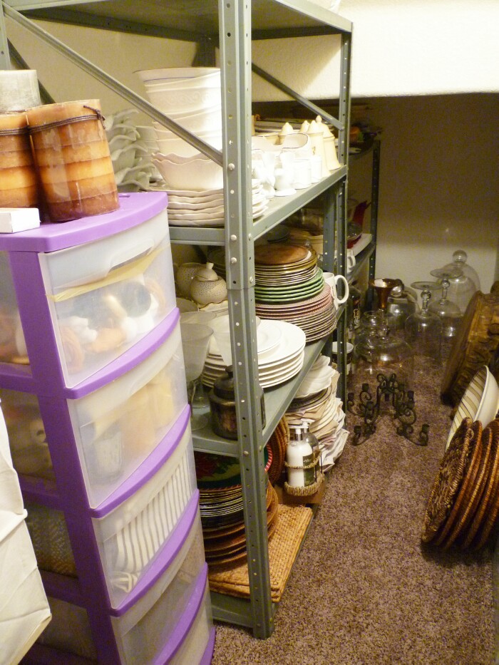 The minute we moved into this home I knew that the space under the stairs would be my “Dish Room”. It is right next to the kitchen, has plenty of space and I needed somewhere to store my dish hoard. I’ve even thinned out my dish stash, but there is still a lot.