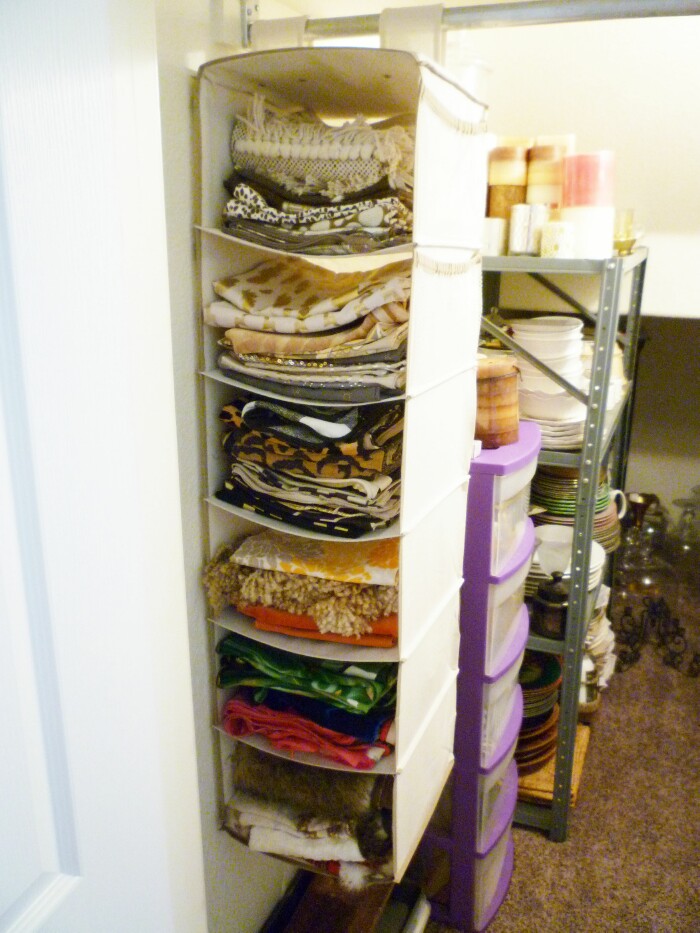 I’ve stored them in drawers before and that works great, but I don’t have room for a chest in this space, so I got one of those fabric closet storage hanging cubes and it works perfectly. 6 cubes so I could sort by color.
