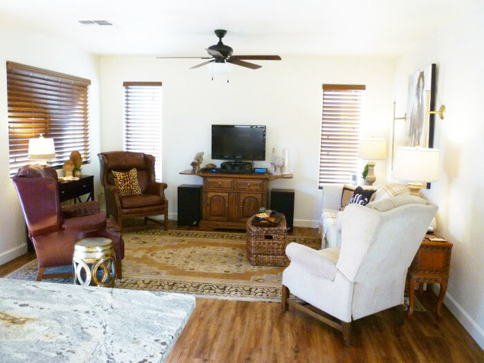 The wall you see here backs up to the stairs and is the first wall on the right as you enter the space. Now we have a thousand and one projects that we would like to do, so new furniture has not been in the mix. I have really, really wanted a pool and that costs both arms and both legs (exaggeration – sort of), so furniture is not in the budget at all. Everyone has their main wants, and with our hot temps here in the desert, a pool is my #1 want.