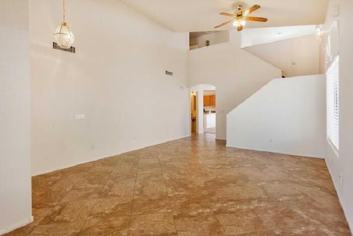 One of the quirks of our “Builder Basic” is how this house had some of the strangest ceiling fans in the strangest places. Case in point – – – Here is a picture showing how the living/dining area looked when we bought the house. You can see the hugger ceiling fan on the two story ceiling right where a dining chandelier should be.