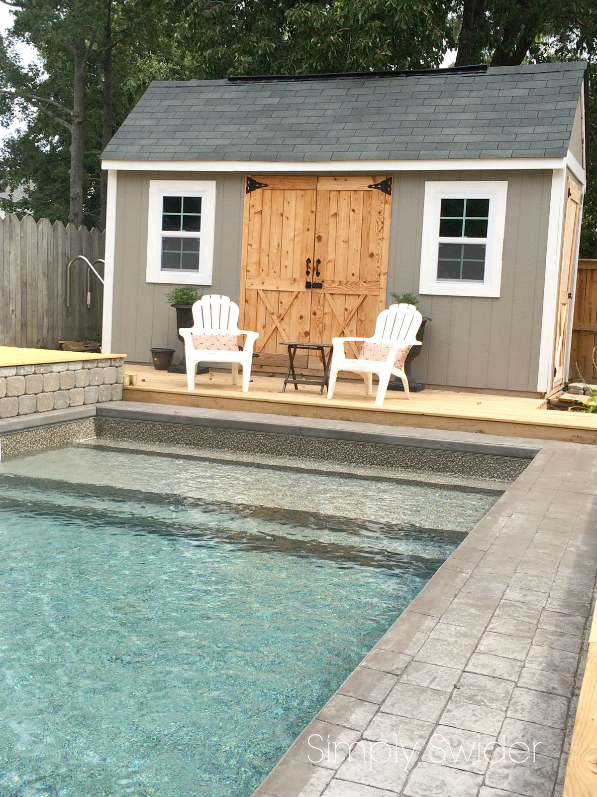 Here’s a shed pool house that Simply Swider added to their backyard. Mine is not near this grand, but maybe I can make mine look really cool.
