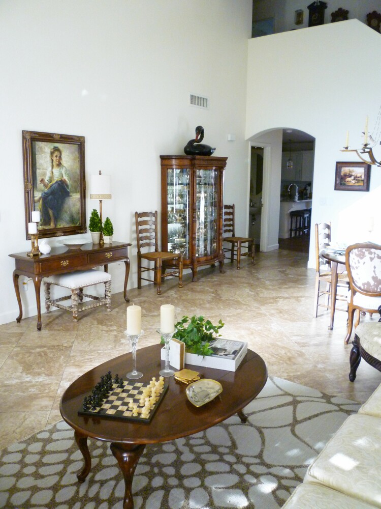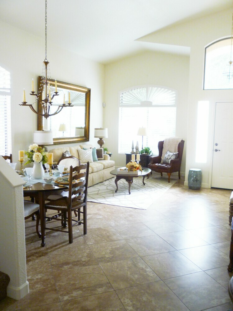 Some of your suggestions I had already tried like placing the sofa in front of the window. A couple of you were adamant that should be where the sofa is placed. I tried that when we moved in and it was really bad, I hated it. The sofa just looked like it was stuffed in the window nook and way too crowded, then placing chairs across from it was really not pleasing to the eye and it didn’t make for a good conversation area. Since the recess is 5 ft deep and only 9 ft wide the coffee table had to be so far out in front of the sofa that it was useless to really use. If it was closer then you couldn’t walk around it to get to the sofa. Two chairs backed up to the dining table was really a lot of chairs to look at and was just all wrong. I know a few of you thought that was the perfect arrangement, but believe me, it really doesn’t work at all.