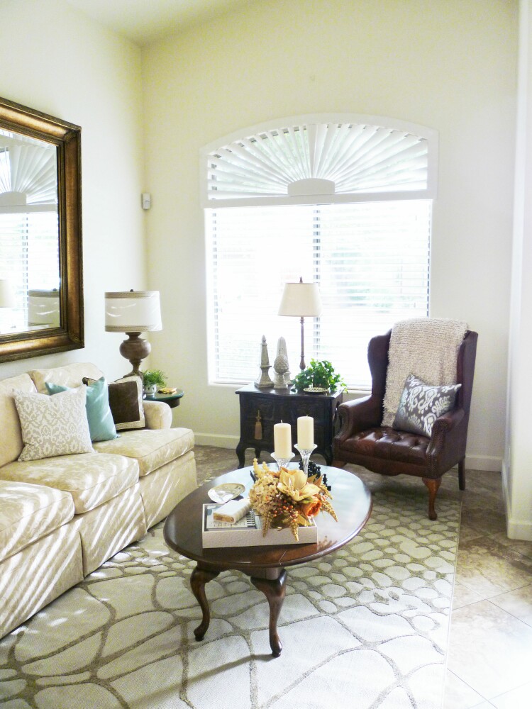 The one thing in common you all suggested was to add some drapes and find a rug. I agree about both of these. So I am going to find or probably make drapes since I need some really, really long ones. I am now trying to figure out the rod situation. I think I want them hung high above the arch of the window, so not sure about rod – maybe white or lucite – not sure. I will make a decision about the mirror after the drapes are up. I did find the rug I love and the larger size just came and it looks awesome. Just enough pattern to be fun.