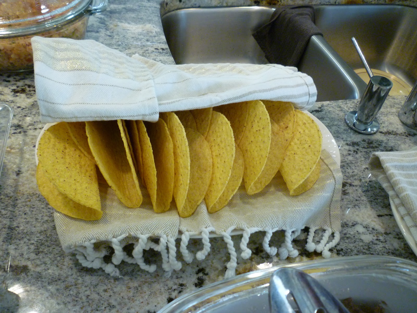 I am doing a Taco Bar for dinner. This is such an easy way to feed a lot of people. Most of the food can be cooked way in advance and then put in the oven at 150°. Here is how I will set up my buffet on the peninsula of my kitchen counter. (I always do a dry run to make sure it will flow)