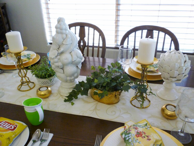 Since the only time everyone could get together in time to say goodbye to our grandson was Friday night – (everyone works) – it only made sense for me to have dinner at our house. I love doing that and it really makes things easy for everyone to just come on over after work. I needed to set both the breakfast and dining room tables since there would be 15 of us.