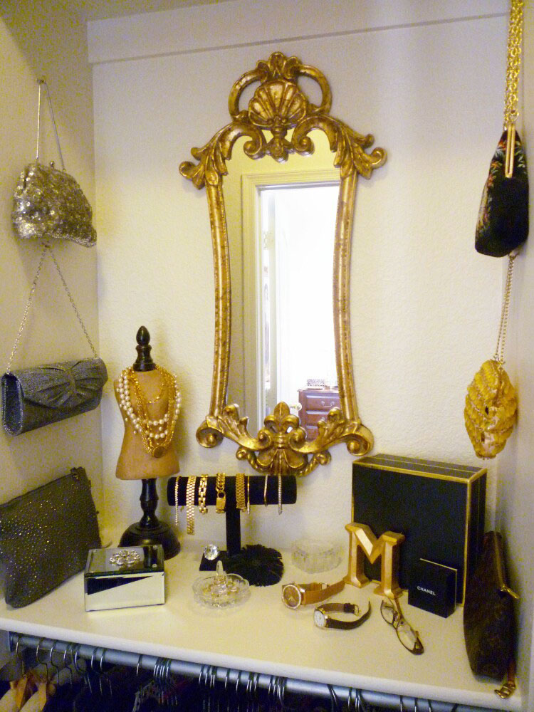A pretty mirror, some hooks to hold my evening bags and a shelf for everyday jewelry. This is so handy to just grab my everyday things and run when I am getting dressed.