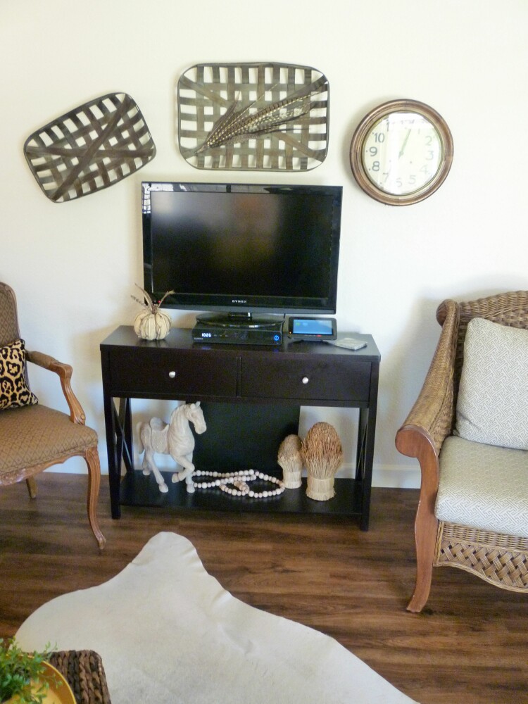 This room is one that I am wanting to totally redo furniture wise, so that makes it extra hard too. I like the size of the console that the tv is on even if our tv is really small. I just don’t like the black color. I need to paint it or replace it. I also want to get a new sofa, coffee table and replace the wicker chair and the two recliners. Bamboo blinds for the windows would be nice too. I think you get the picture. This room needs a redo of some sort. The only thing I currently like is the horse painting and the louis style chair and even that might get the wood refinished and some new upholstery.