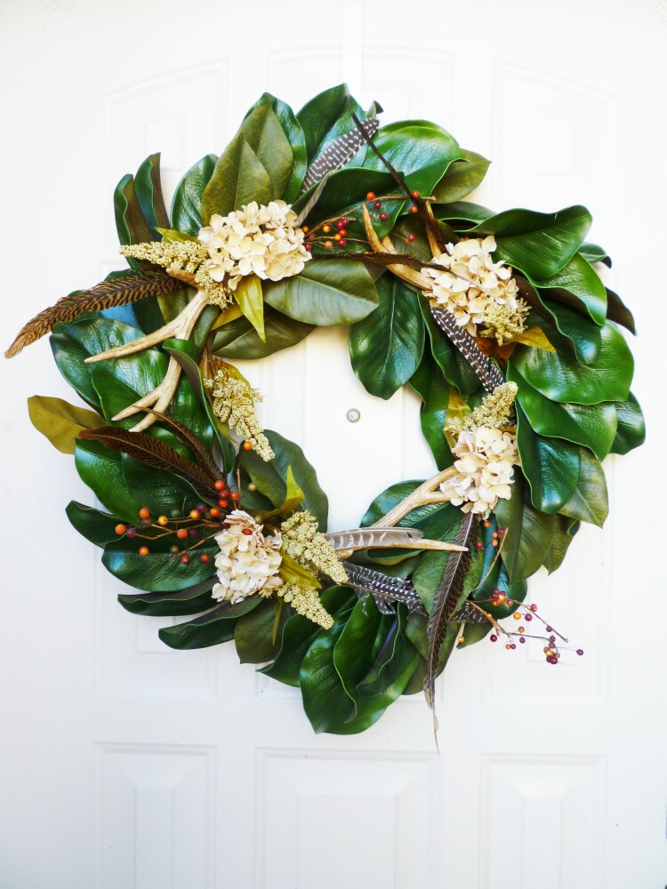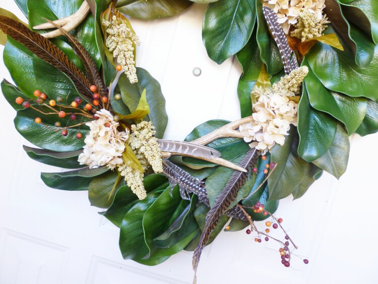 Alright enough grandma bragging, I found this really pretty faux magnolia leaf wreath at Hobby Lobby and added a few feathers, antlers and flowers from my stash to give it a fall look.