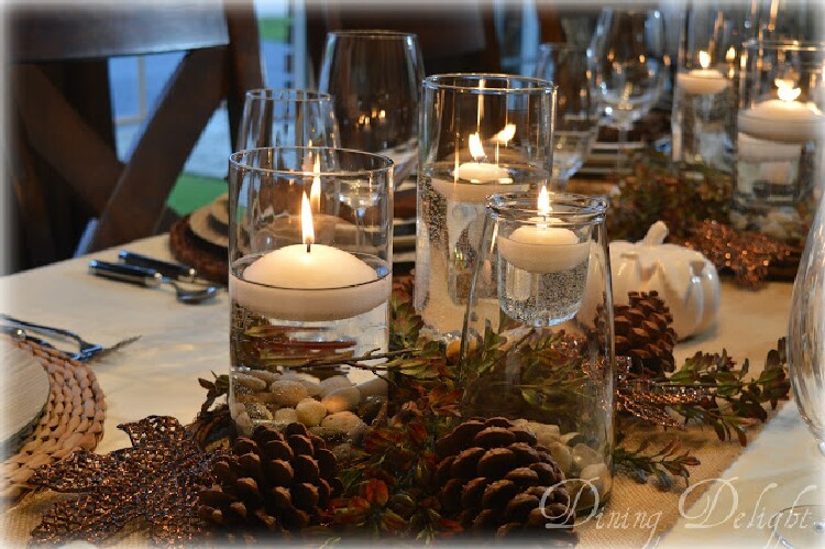 I am always looking for a different idea for a table centerpiece, especially for a really long table. I love this Cylinder idea from Dining Delight. I think you could buy cylinders at the $1 store and then get some floating candles at Walmart and you are good to go. Love this.