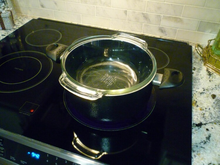Create a double boiler by adding water to a pot and placing a glass bowl over it. You need a pretty good size bowl for all the candy wafers.