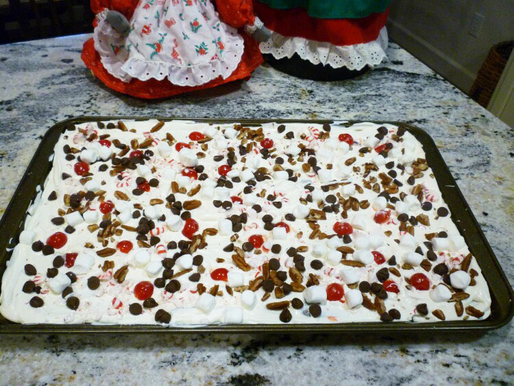 This one has marshmallows, cherries, chocolate chips, mint candies and pecans. (Use whatever you have on hand, it doesn’t take a lot of anything and everything is wonderful on chocolate. )