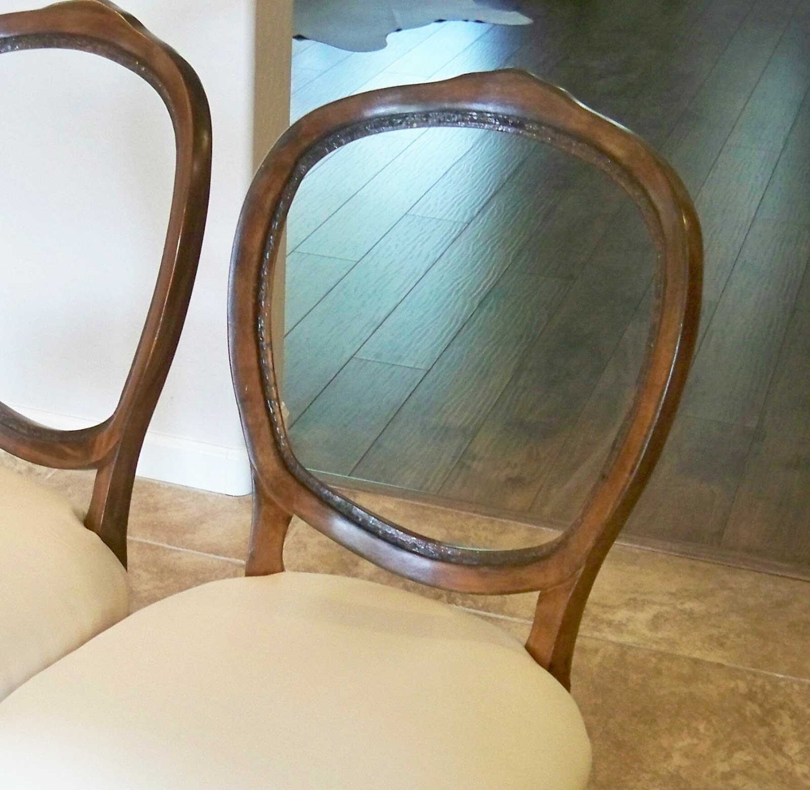 Remember, this is what they looked like when I bought them. Really ugly upholstery and kind of an orange/blonde wood frame color.