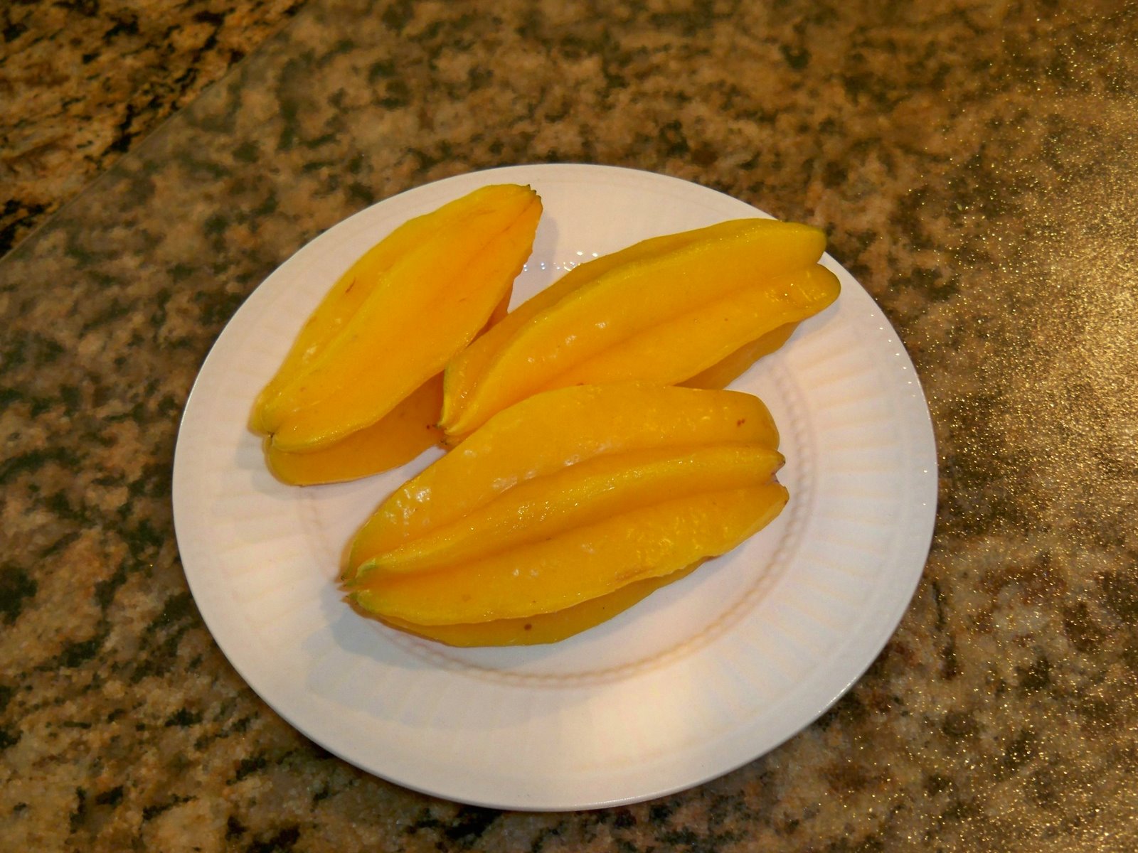 When you cut across the fruit they look like stars. I think the shape is so pretty in a fruit salad or topping ice cream. I also love to eat them just like they are as a snack. See the little seeds. There are clubs all across the country called Rare Fruit Growers where you can find out information about Starfruit and other kinds of rare fruit trees to grow, or you can grow them from seed. Cut through the fruit carefully so not to cut the tiny seeds. Wash seeds carefully and dry them. Plant them in good potting soil in a pot. They can be grown in a pot for several years. If you live in a cooler climate they can be placed in front of a window inside and when the weather warms put outside in full sun. From seed it will take about 3 to 4 yrs. to bear fruit, but in the meantime they do have pretty leaves that stay green all year long. Try one, they are such fun.