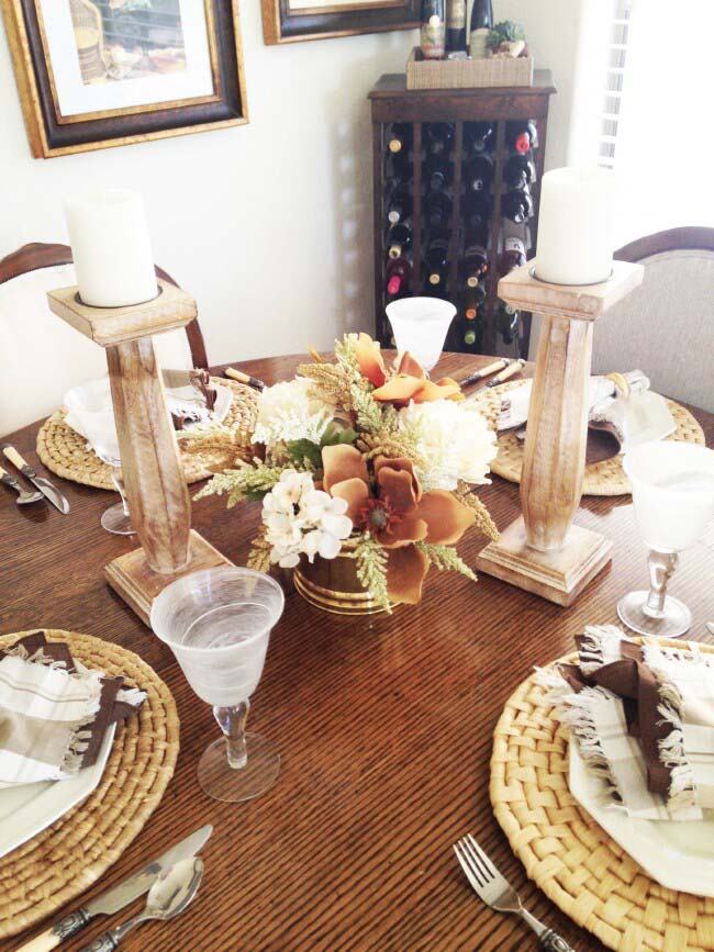I am using wicker placemats to tie in with the wicker baskets in the living room. The floral centerpiece is made up of assorted flowers from my stash. The tall weathered wood candlesticks are the star of the show.