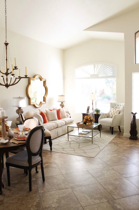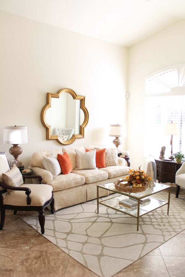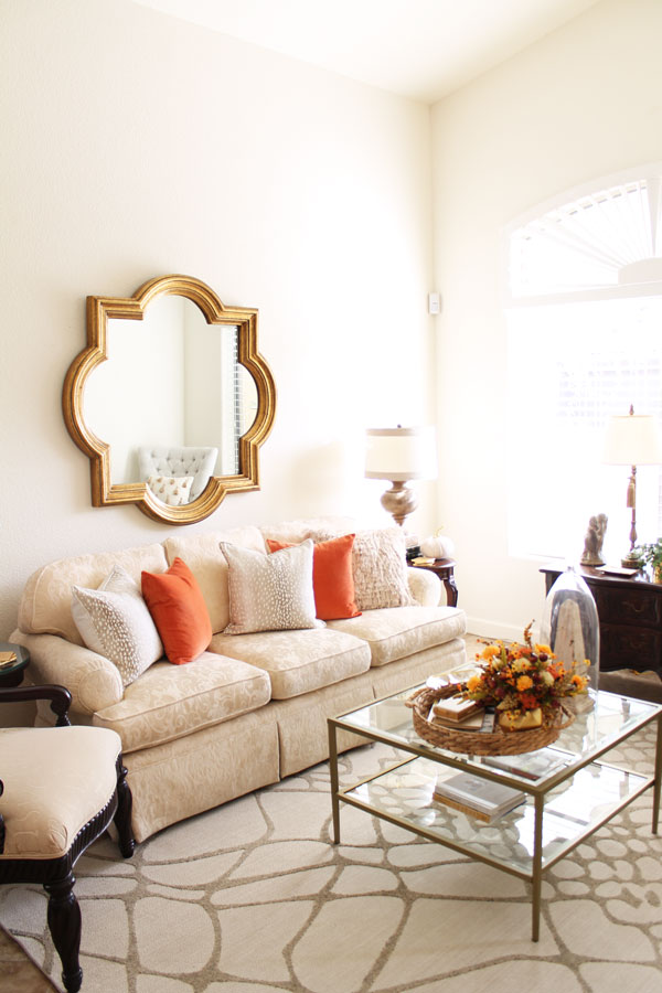 I am still auditioning furniture, art and accessories for my Mini Living Room Makeover. I have been using some art my daughter loaned me since I gave the Big Mirror away. I do like it, but I really love a mirror in this small space. I found this wonderful mirror and thought maybe since it was a good size it might work. It has a substantial frame, a fun shape and is 46″ wide and tall.