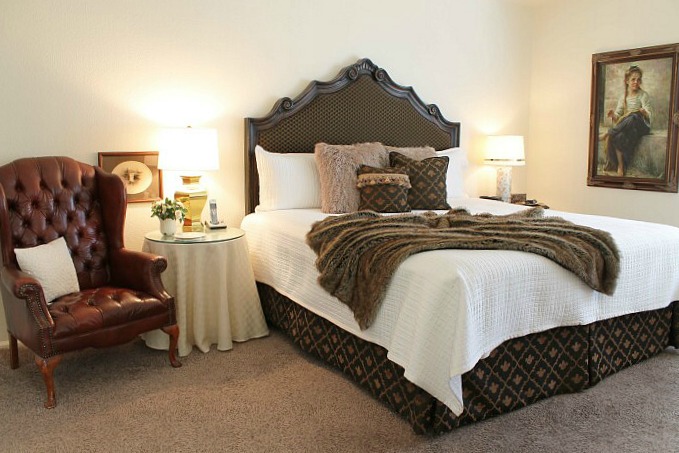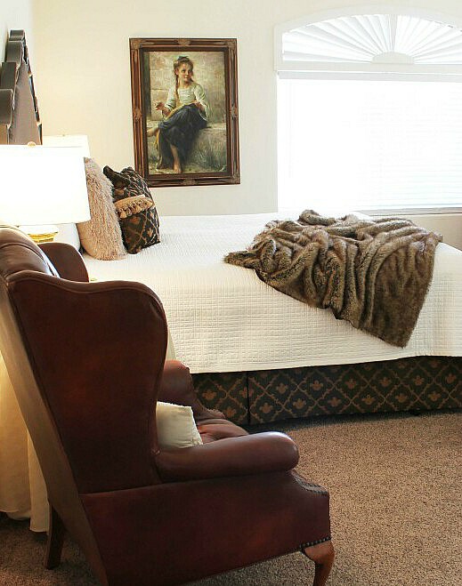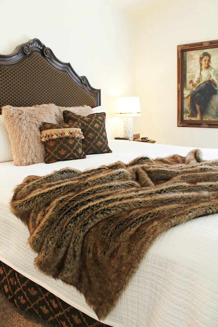 Love the way the pillows create a custom designer look for the bed and the fur makes it such a cozy setting. Plus that leather chair is a long time favorite.