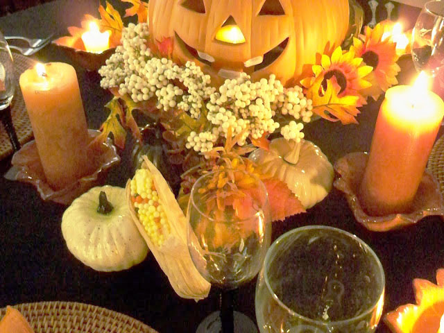 Now I am not into scary, but I do like to be part of the season, so a few years ago I did a Happy Halloween Tablescape. Here is a repeat.