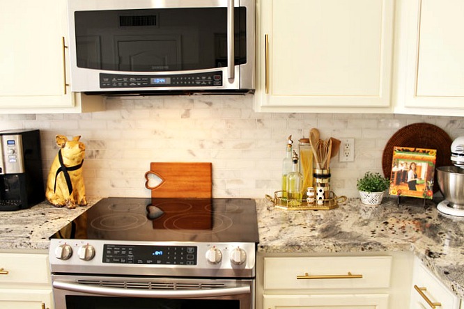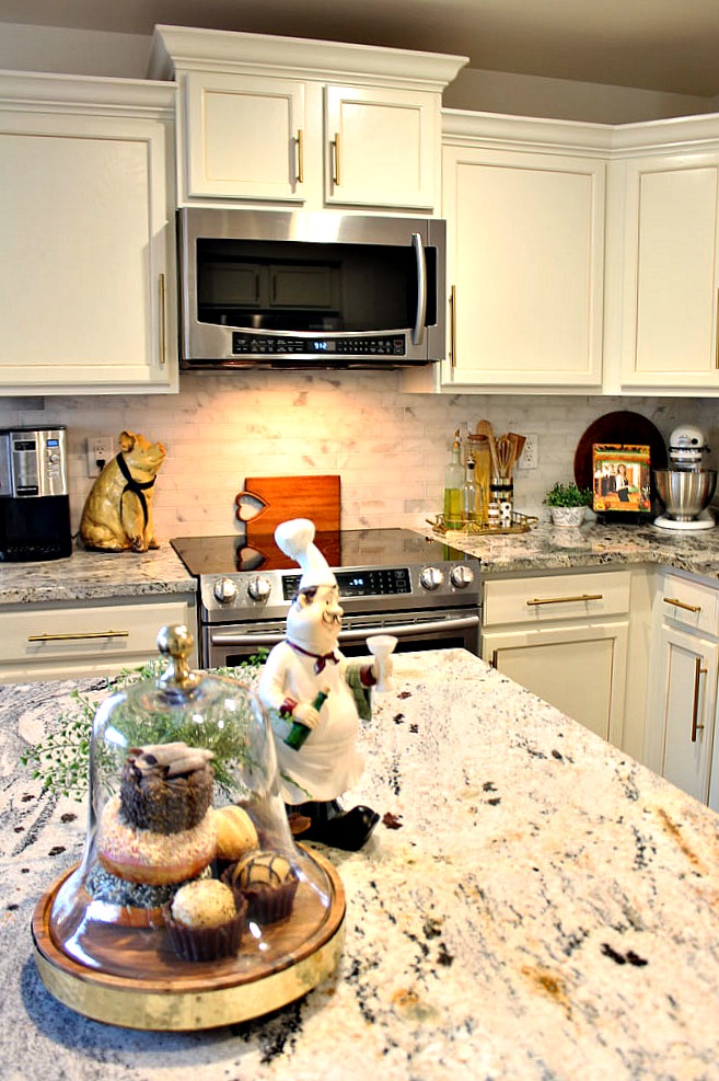I love my little chef so he got to stay out on the island. I added my favorite cloche to hold some of my faux treats. (These are the best – no calories)