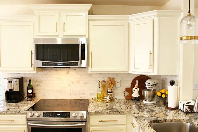 If you are new here, this is what the kitchen looked like when we bought the house. We kept some of the cabinets, rearranged some and added some, then a ton of paint, flooring and appliances and we had a new kitchen. You can see how we did our remodel on a budget here.