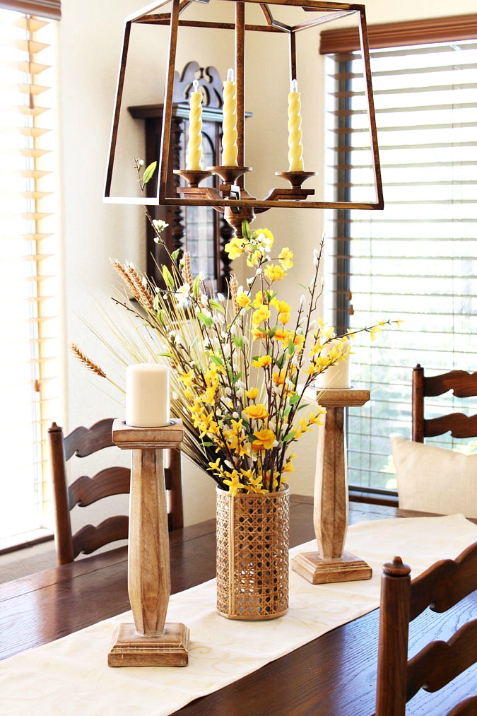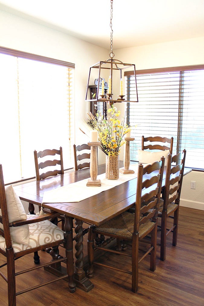 I love that the kitchen eating area is large enough to hold my harvest table. I can easily seat eight here when we have the family over. Some pretty sprigs from the neighbor’s yard are perfect for a Spring bouquet.