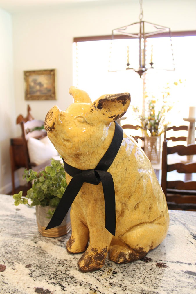 The island is where I like to add a few decor pieces. My fat yellow pig is such a statement piece and yellow is so pretty for Spring too.
