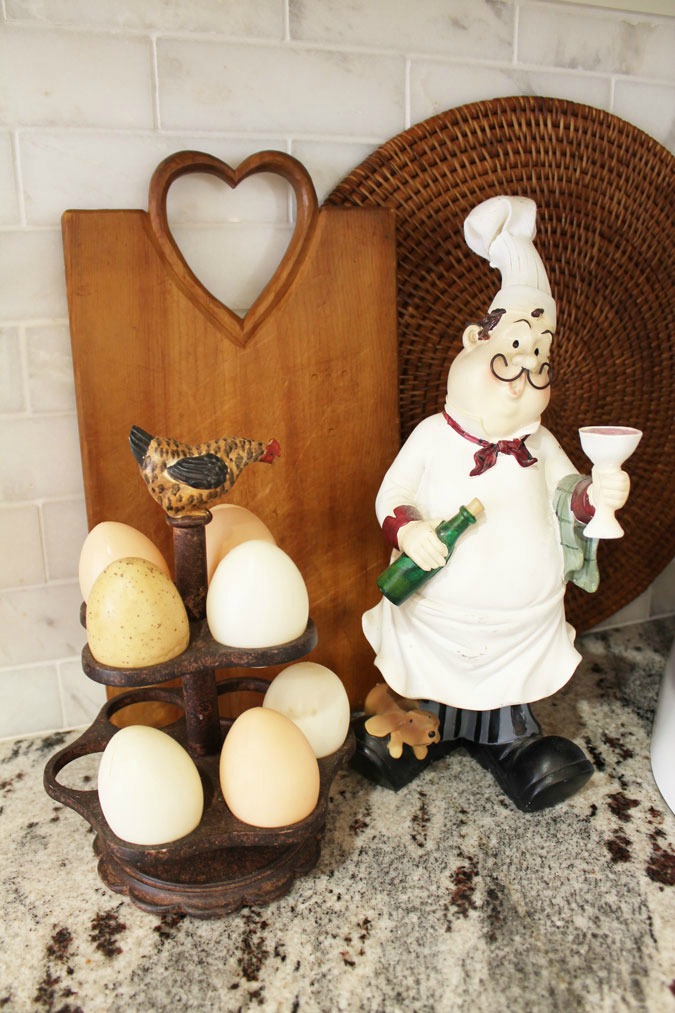 This corner is a really hard working corner in my kitchen, and one I stare at most of the time. I love to add a few fun decorations to this corner. My oils and utensils, mixer, cutting board, and of course my little drunk chef are usually in this corner. A bunch of lemons and – —