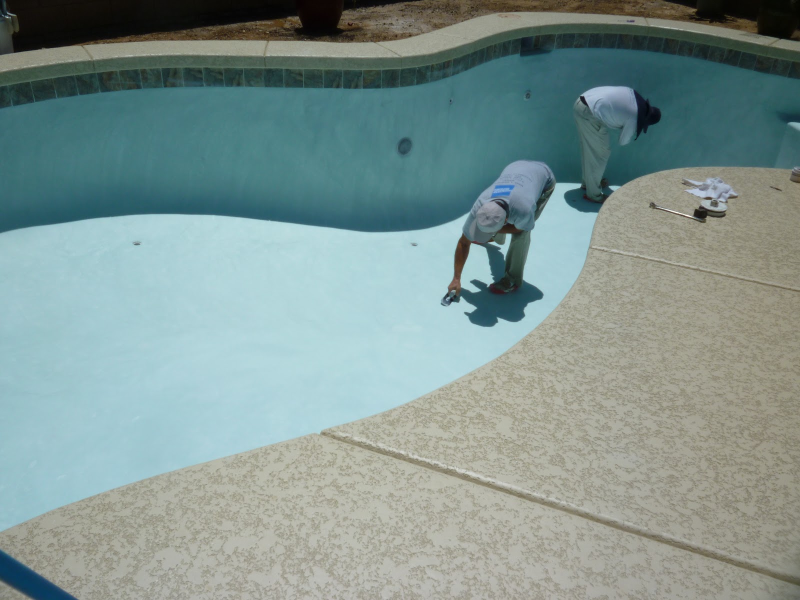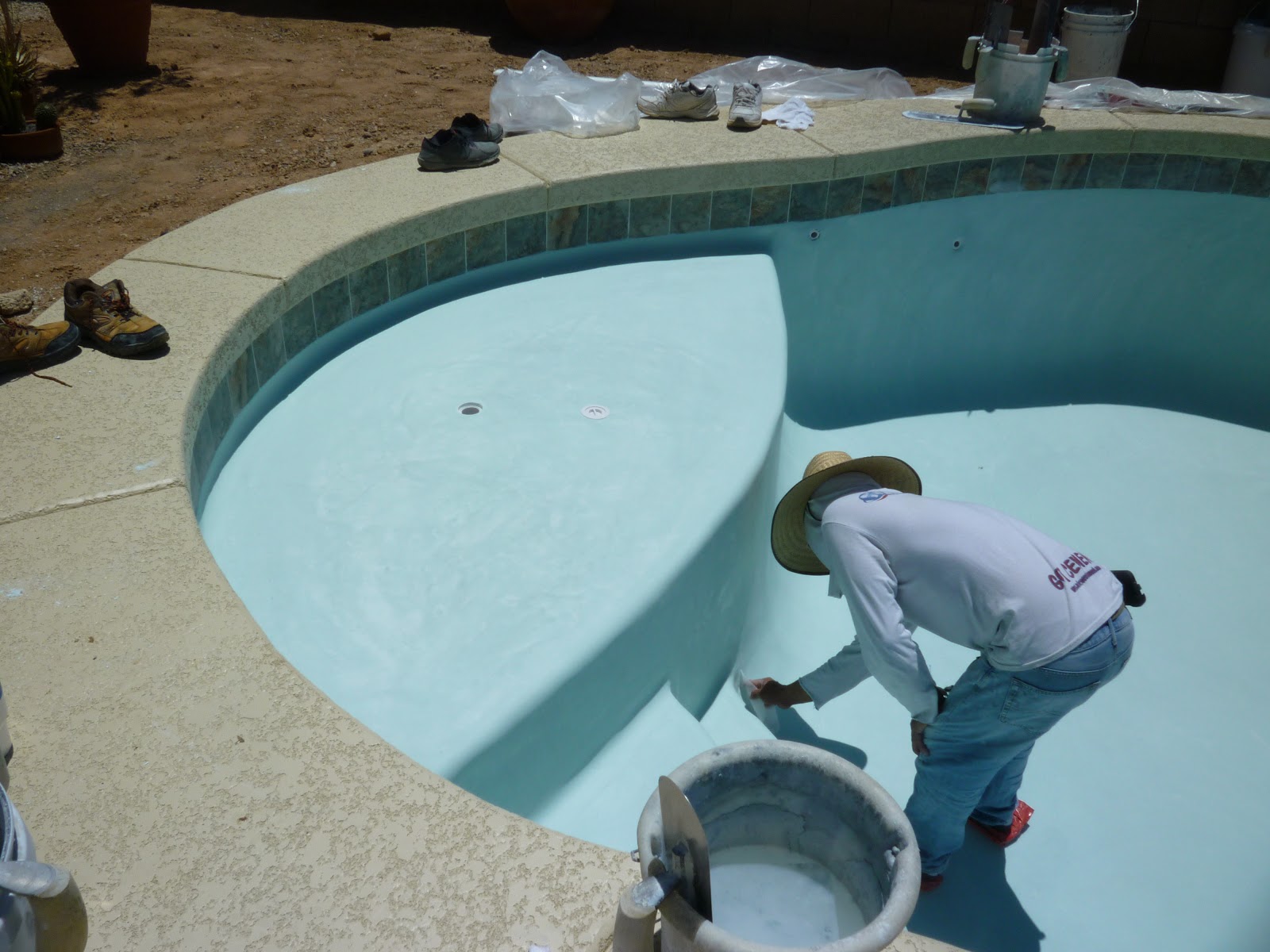 6/5 A crew of 5 showed up to do the plaster inside the pool We chose a product called Pebble Sheen. It has a really smooth surface to it with really tiny pebbles that give the plaster some texture and character.